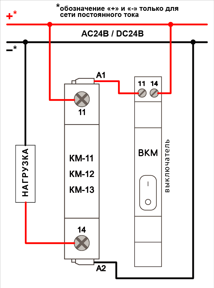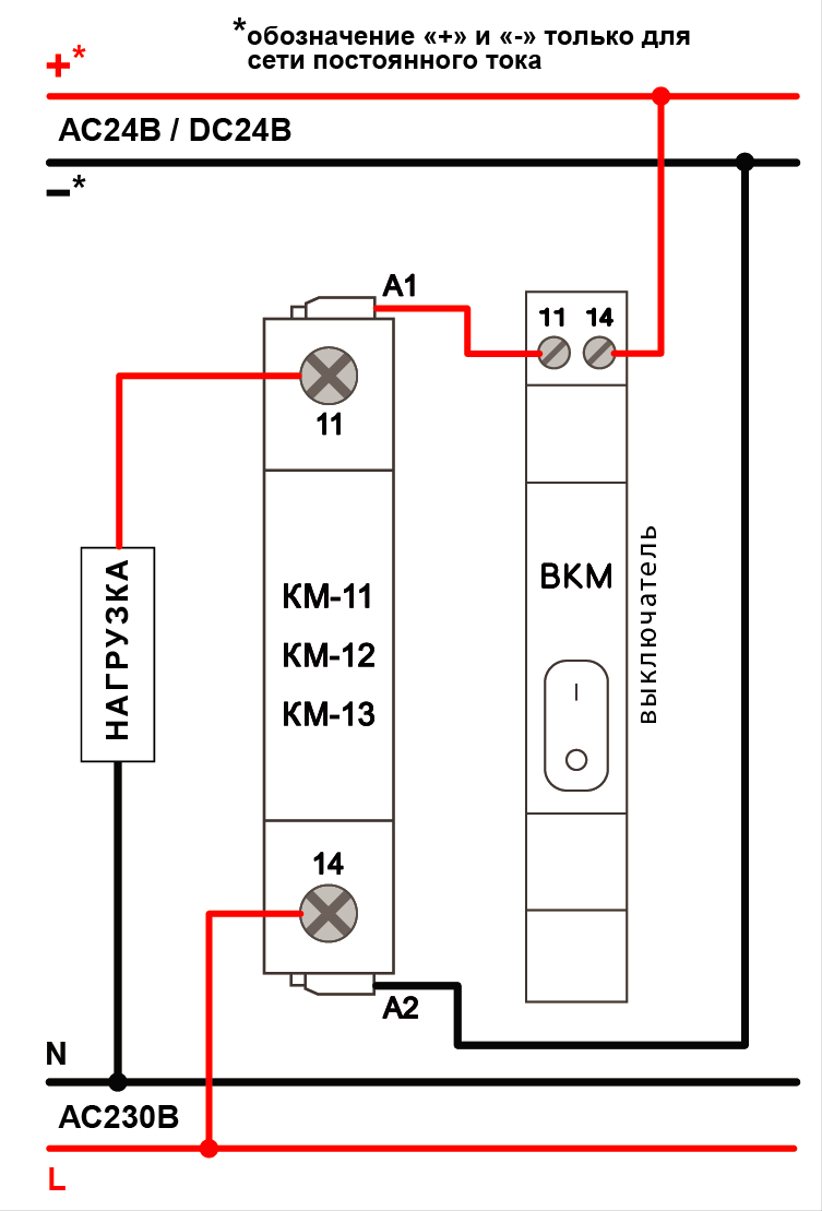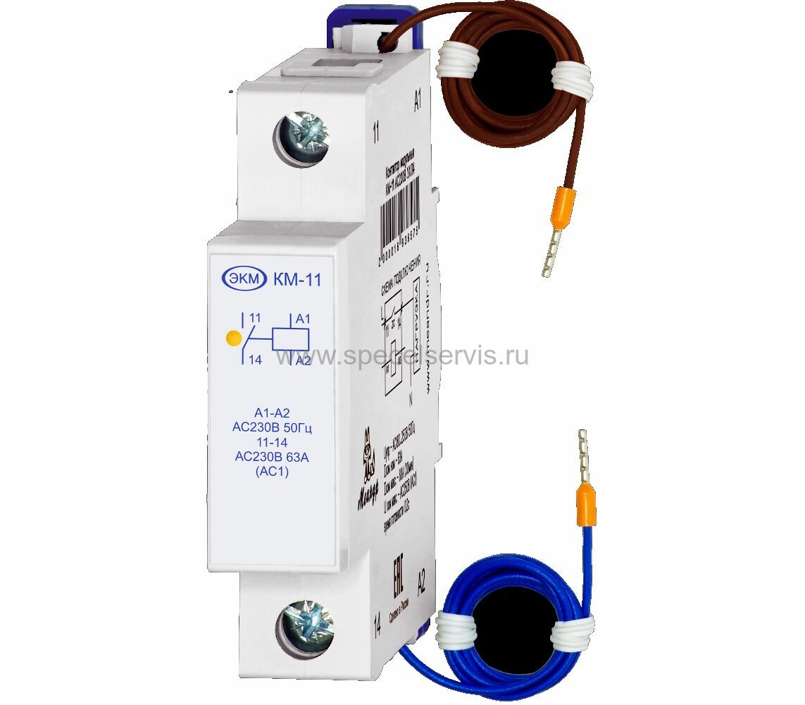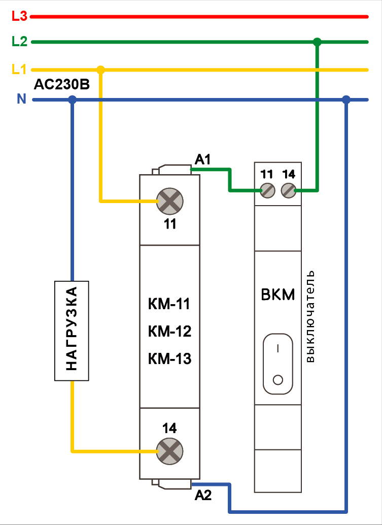 Контакторы модульные типов КМ-11, КМ-12, КМ-13 (далее контактор) предназначены для гальванической развязки между силовыми цепями и цепями управления дистанционного включения нагрузки путём подачи управляющего напряжения на выводы А1 и А2 контактора.