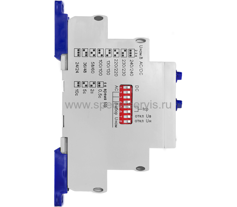 Реле выпускаются в унифицированном пластмассовом корпусе с передним присоединением проводов питания и коммутируемых электрических цепей. Крепление осуществляется на монтажную рейку-DIN шириной 35мм (ГОСТ Р МЭК 60715-2003) или на ровную поверхность. Для установки реле на ровную поверхность, фиксаторы замков необходимо раздвинуть. Конструкция клемм обеспечивает надёжный зажим проводов сечением до 2,5мм2. На лицевой панели расположены: поворотный переключатель верхнего порога срабатывания «U>%», поворотный переключатель нижнего порога срабатывания «U<%», зелёный индикатор «норм.», красный индикатор «авар.». На боковой поверхности расположен DIP- переключатель для выбора номинального напряжения питания (переключатели 1-4), задержки срабатывания (переключатели 5-6) и диаграммы работы (переключатели 7-8).