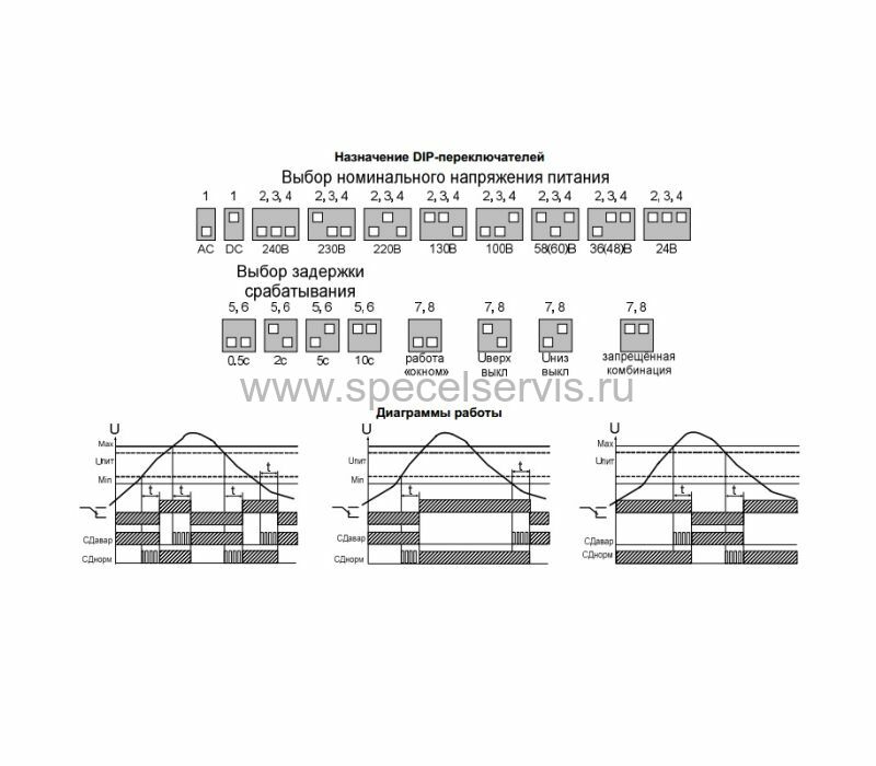 Сбоку на приборе размещен DIP- переключатель для выбора номинального напряжения питания (секция 1-4), задержки срабатывания (секция 5-6) и диаграммы работы (секция 7-8).