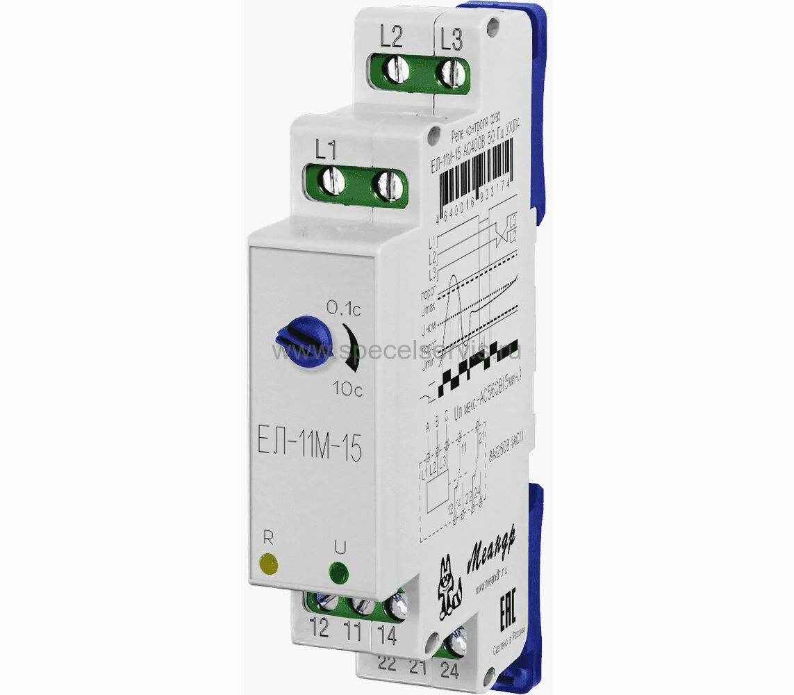 Реле контроля фаз ЕЛ-11М-15 - предназначено для использования в схемах автоматического управления для контроля напряжения в трёхфазных сетях без нулевого провода, для контроля порядка чередования фаз, обрыва и «слипания» фаз, превышения (снижения) напряжения выше (ниже) фиксированного значения, а также контроля асимметрии фаз. Реле предназначено для защиты источников и преобразователей электрической энергии. Технические характеристики реле приведены в таблице ниже