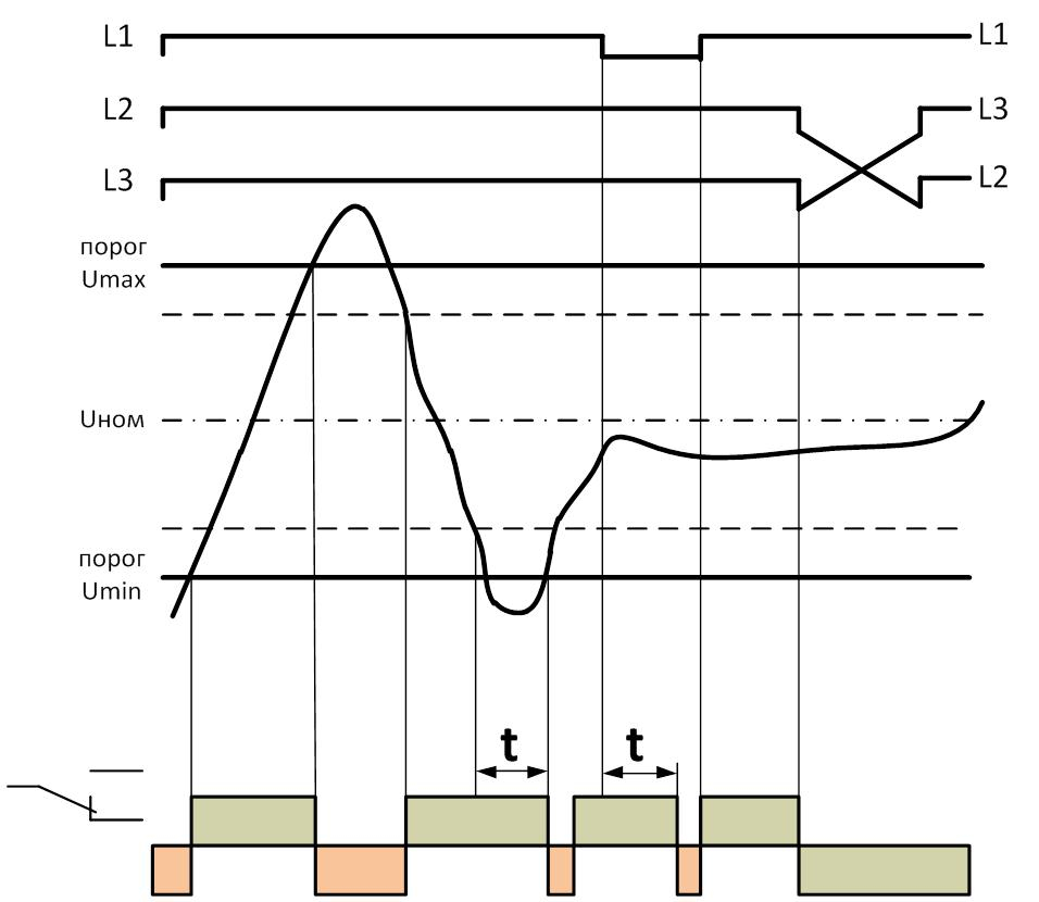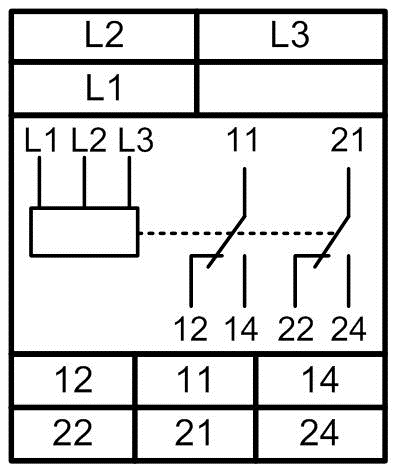 При подаче на реле трёхфазного напряжения включается индикатор «U» и осуществляется проверка всех контролируемых параметров. Если все параметры в норме, включается встроенное реле (контакты 11-12 и 21-22 размыкаются, контакты 11-14 и 21-24 замыкаются) и включается индикатор «R». При обнаружении обратного порядка чередования фаз, пропадании двух или трёх фаз, при превышении фиксированного порога напряжения - реле выключается без отсчёта установленной задержки времени срабатывания. При асимметрии напряжения, снижении напряжения ниже фиксированного порога или обрыве одной из фаз, реле выключается через время t, установленное регулятором времени срабатывания. При возвращении параметров в норму реле включается без задержки.
