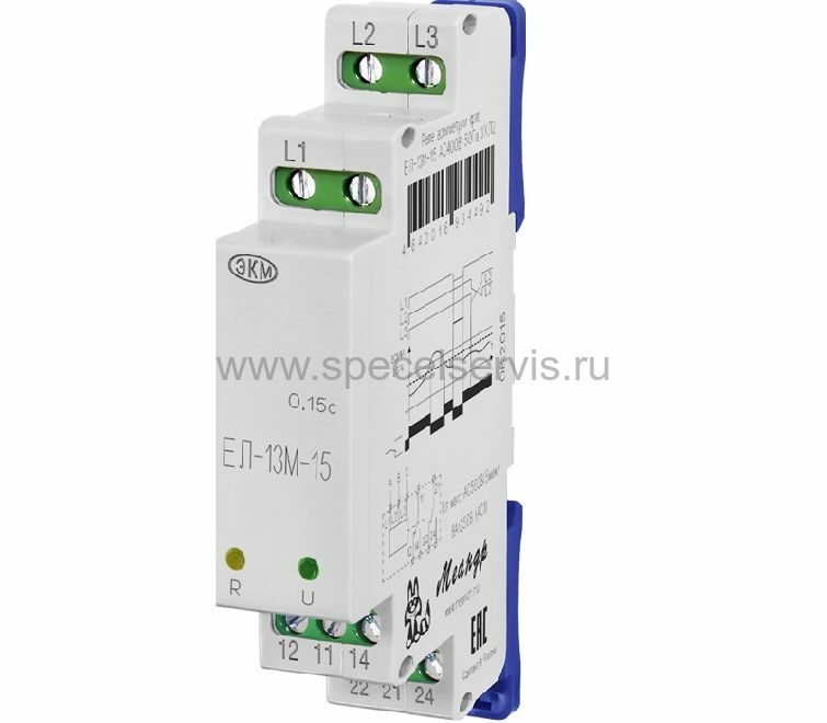 Реле асимметрии фаз ЕЛ-13М-15 предназначены для контроля трёхфазного линейного напряжения в трёхпроводных сетях (без нейтрали). Реле контролирует обрыв и «слипание» фаз, асимметрию (разбаланс) линейных напряжений, превышение напряжения выше фиксированного значения.