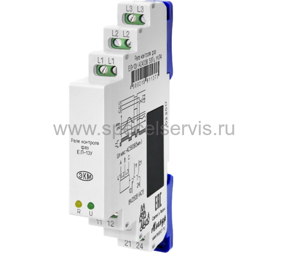 Реле асимметрии фаз ЕЛ-13У предназначены для контроля трёхфазного линейного напряжения в трёхпроводных сетях (без нейтрали). Реле контролирует обрыв и «слипание» фаз, асимметрию (разбаланс) линейных напряжений, превышение напряжения выше фиксированного значения.