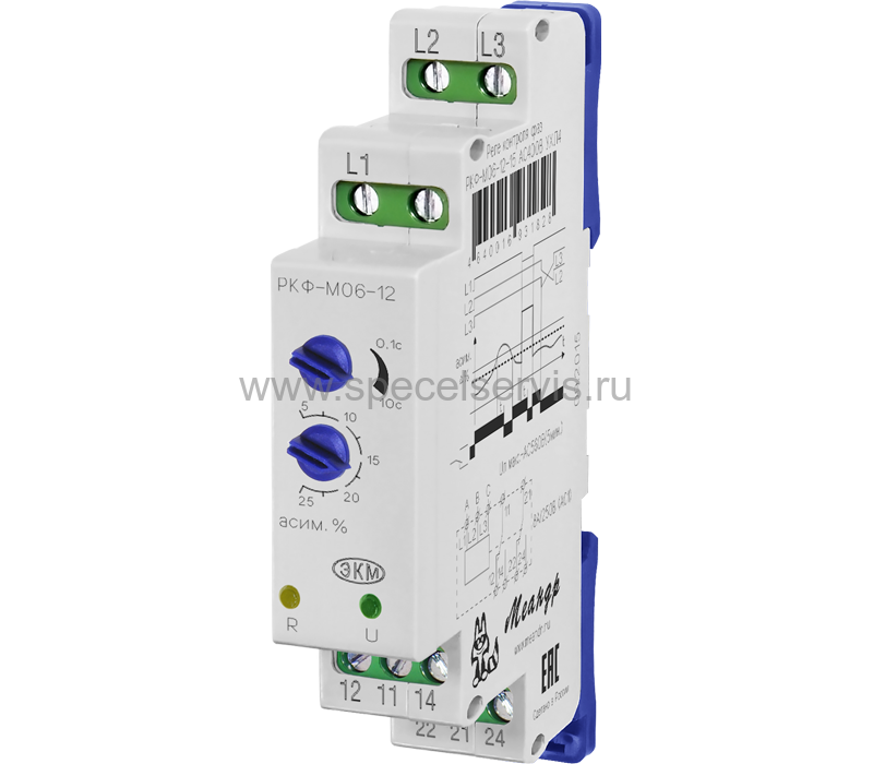 Реле асимметрии фаз РКФ-М06-12-15 предназначено для контроля трёхфазного напряжения в трёхпроводных сетях без нейтрали. Реле контролирует порядок чередования фаз, обрыв фаз, «слипание» фаз, недопустимую асимметрию (разбаланс) линейных напряжений, перенапряжения.