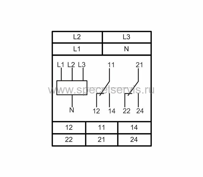 Устройство питается от контролируемой сети и монтируется на рейку-DIN. Три контролируемые фазы подсоединяются к клеммам L1, L2, L3 нулевой провод к клемме N.