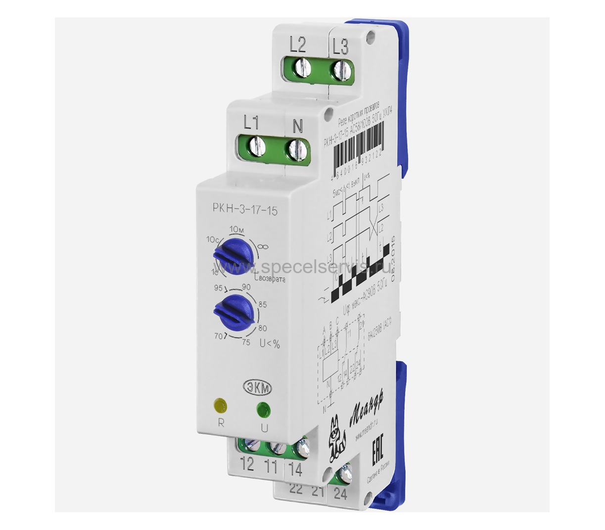 Реле контроля напряжения серии РКН-3-17-15 предназначено для контроля параметров работы четырехпроводных трехфазных сетей (трехфазных сетей с нейтралью), защиты оборудования от работы на пониженном напряжении из-за неполадок в сети, обнаружения кратковременных провалов напряжения по любой из фаз. Питание реле осуществляется от контролируемой цепи.