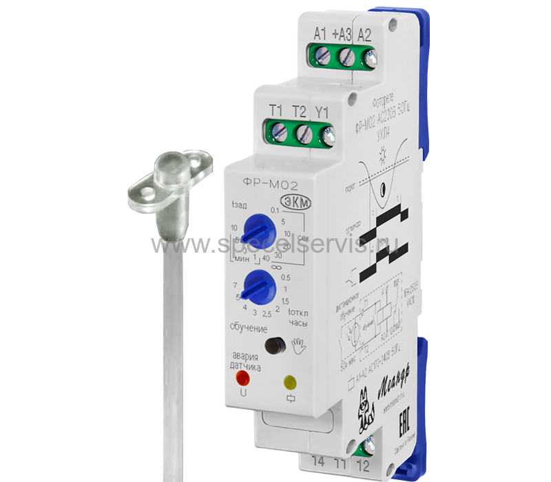 Фотореле ФР-М02 предназначено для автоматического включения и отключения освещения улиц, витрин магазинов, торговых залов, реклам, автостоянок и т.п. в зависимости от установленного порога уровня освещённости. Контроль уровня освещённости осуществляется выносным фотодатчиком ФД-3-1, поставляемым отдельно от фотореле.
