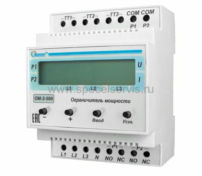 Ограничитель мощности ОМ-2-500 выполнен в корпусе для установки на DIN-рейку.