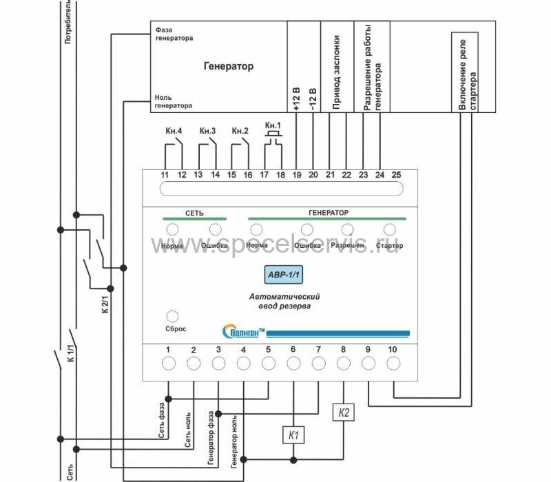 Предназначено для контроля напряжения по однофазному входу, и управления бензиновым однофазным генератором, коммутации нагрузки с помощью внешнего исполнительного устройства.