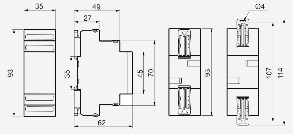 Модуль выпускается в унифицированном пластмассовом корпусе с передним присоединением проводов питания и коммутируемых электрических цепей. Крепление осуществляется на монтажную рейку-DIN шириной 35 мм (ГОСТ Р МЭК 60715-2003) или на ровную поверхность. Для установки реле на ровную поверхность замки необходимо раздвинуть, крепление осуществляется винтами или шурупами через отверстие в фиксаторе. Конструкция клемм обеспечивает надёжный зажим проводов сечением до 2.5мм2. Материал корпуса - пластик ABC.