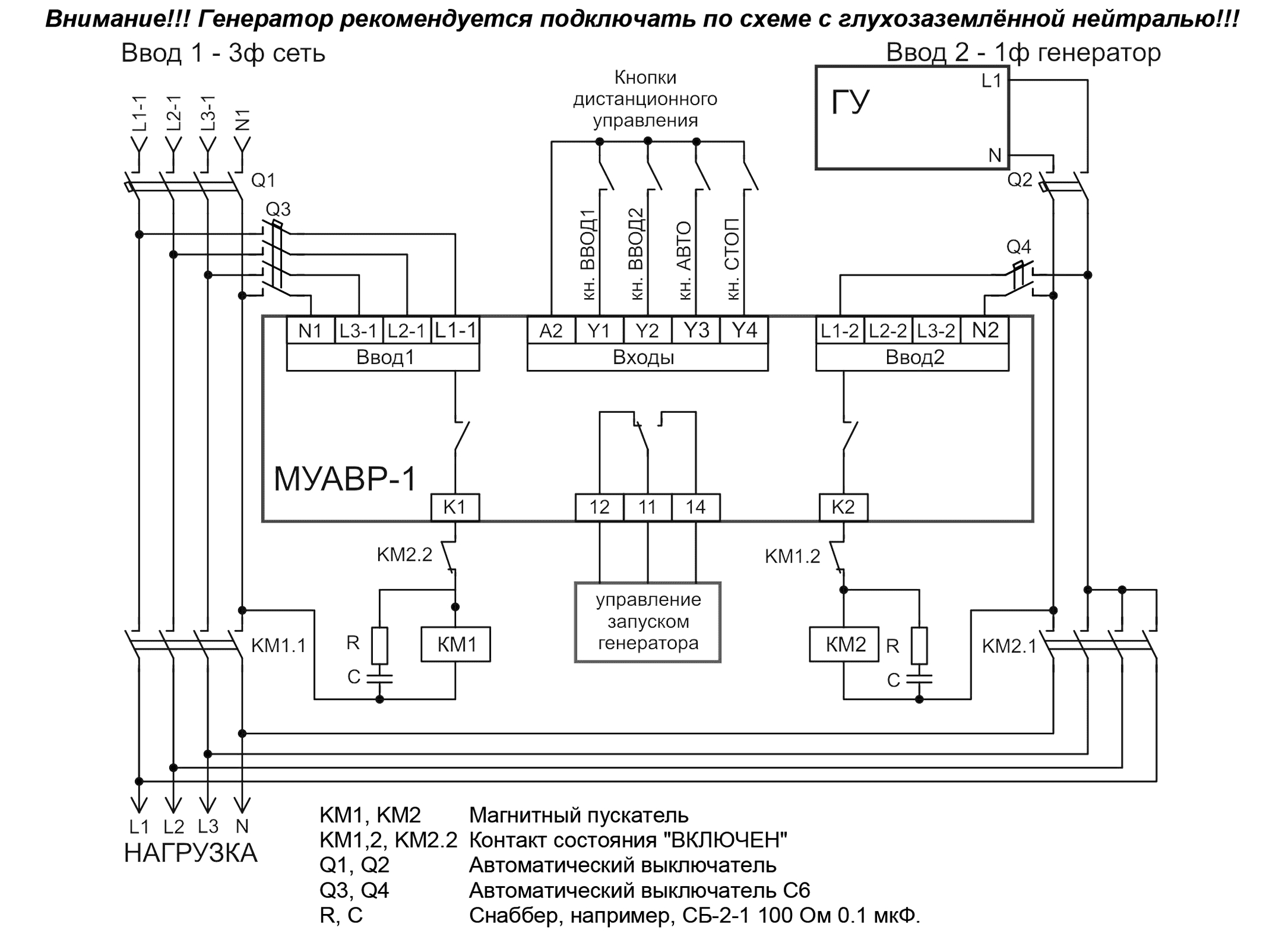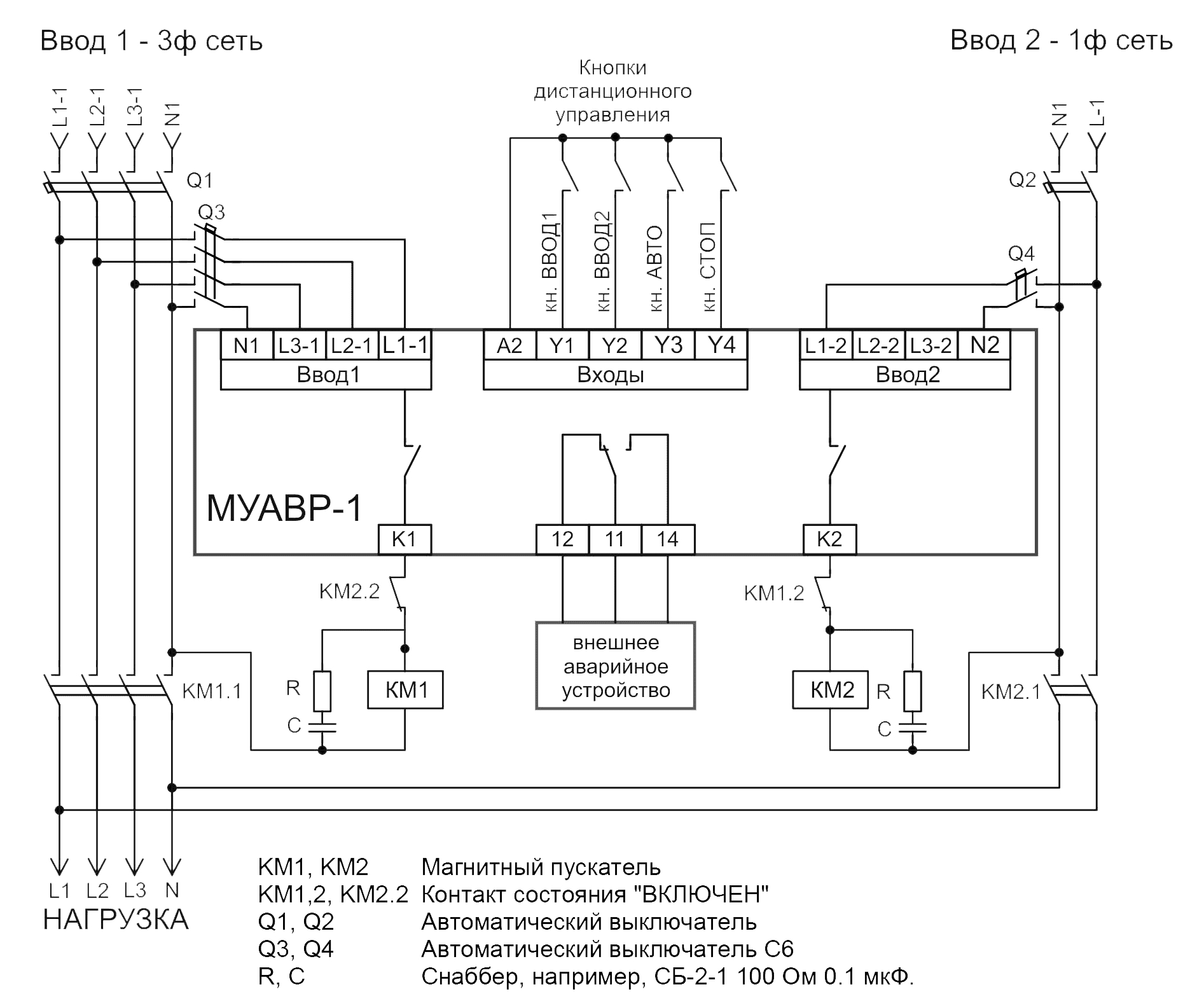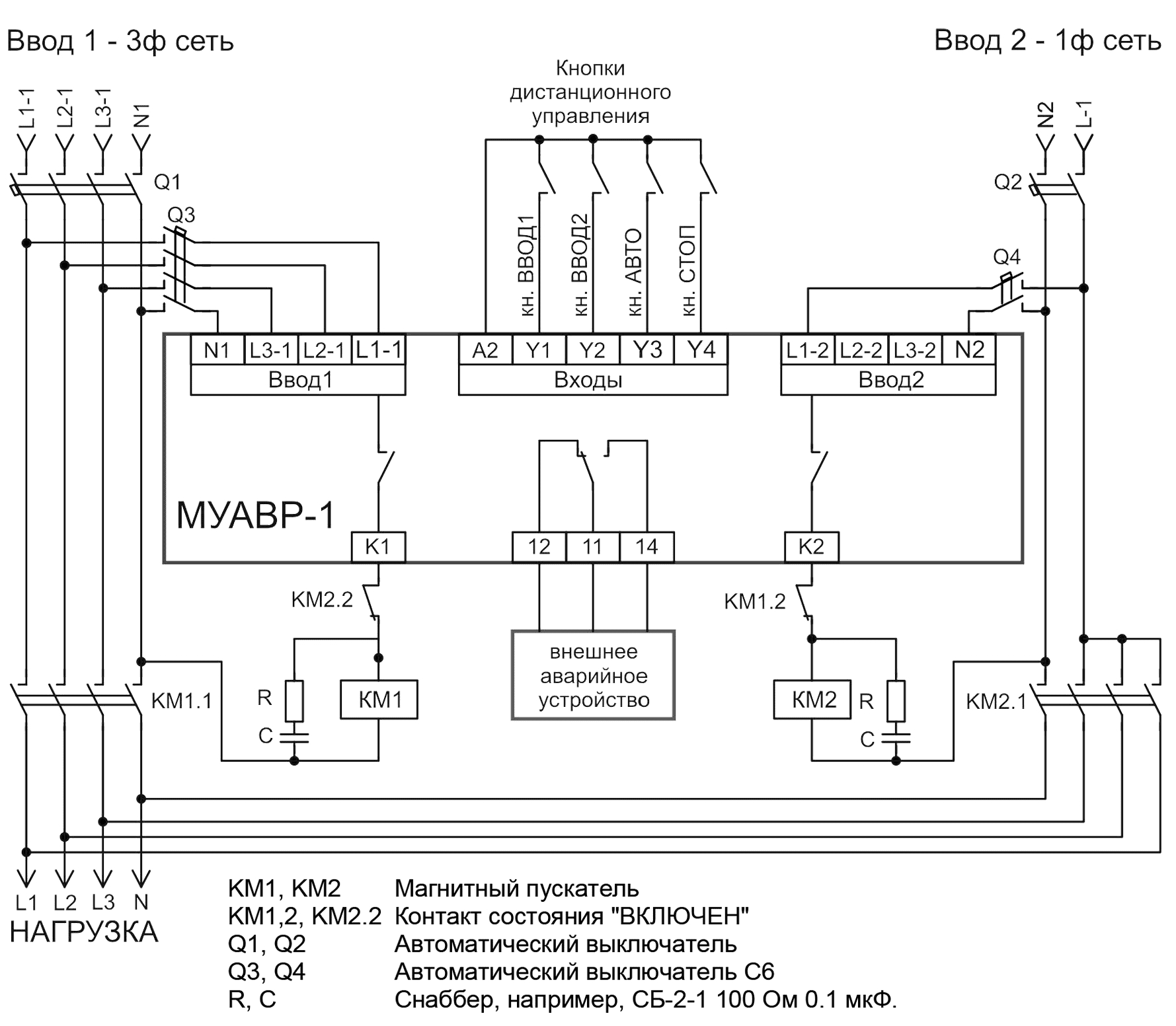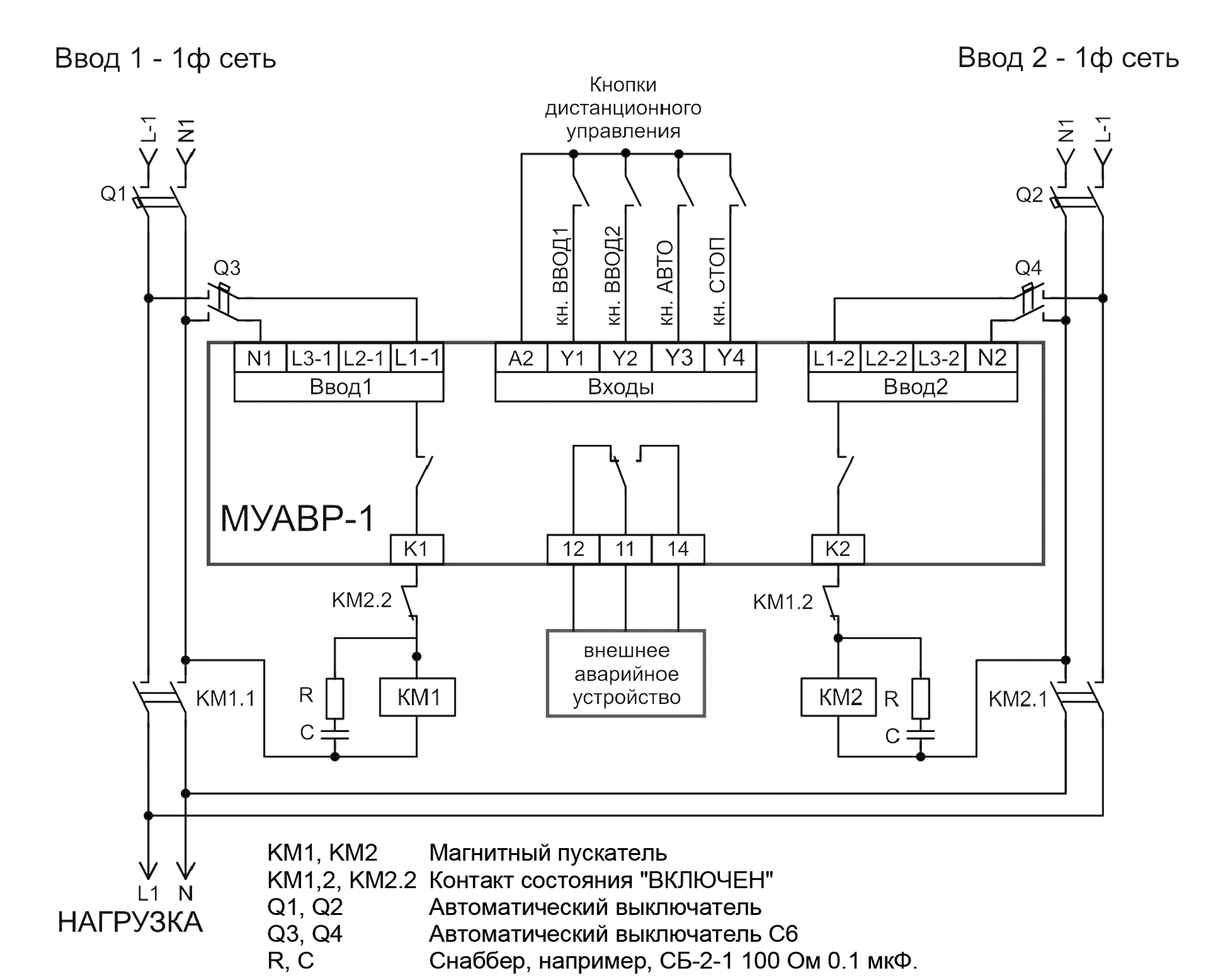 Подключение нагрузки обеспечивает коммутационное устройство (КМ) электромагнитного типа, контактор или пускатель управляемые модулем. При аварии на основном вводе производится отключение нагрузки от основного ввода и переключение на резервный ввод. При восстановлении питания на основном вводе нагрузка автоматически переключается с резервного ввода на основной (при установленном приоритете линии).