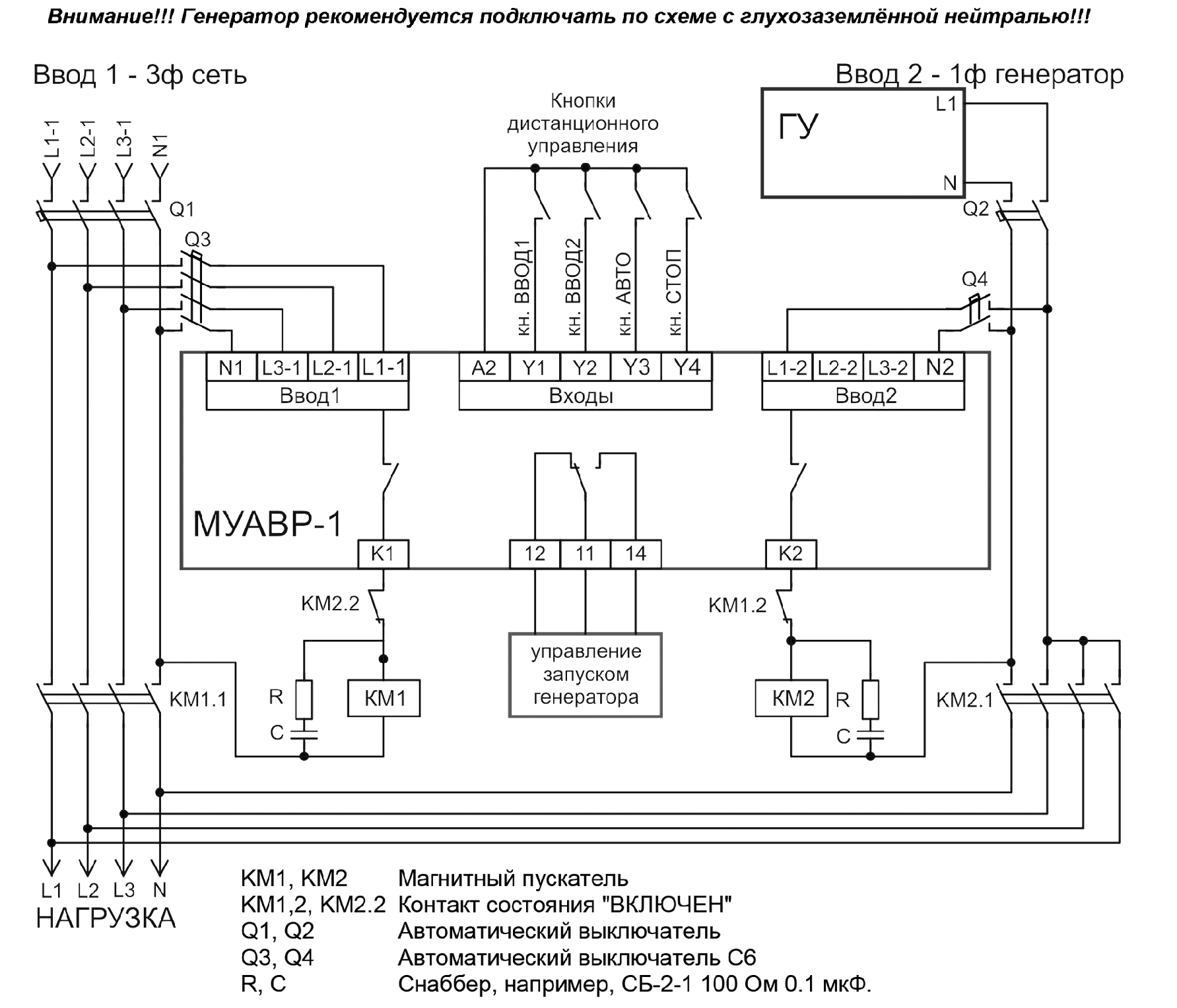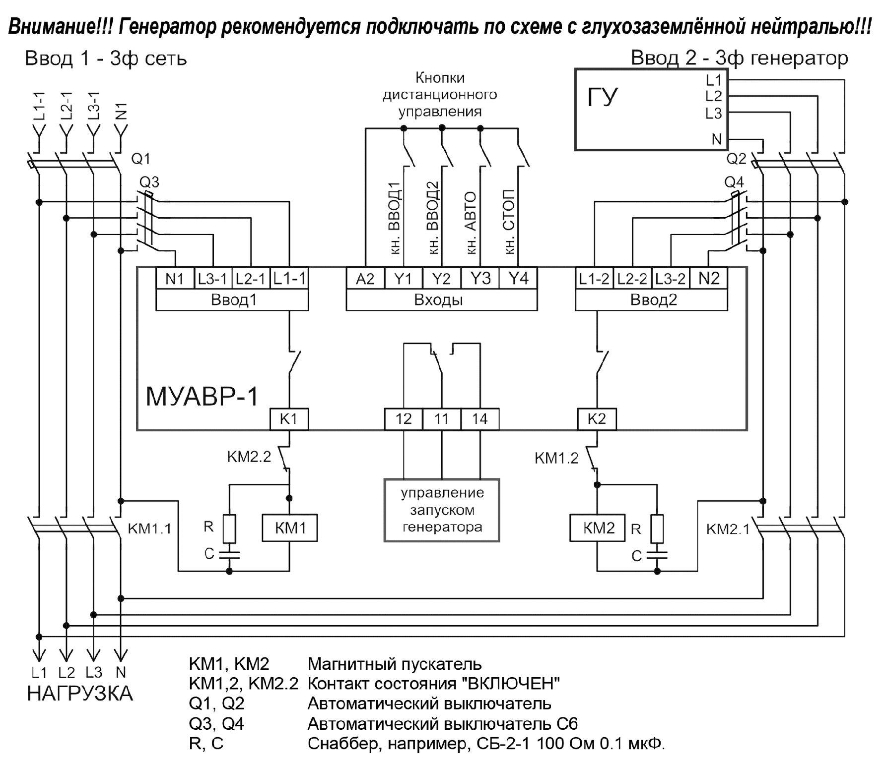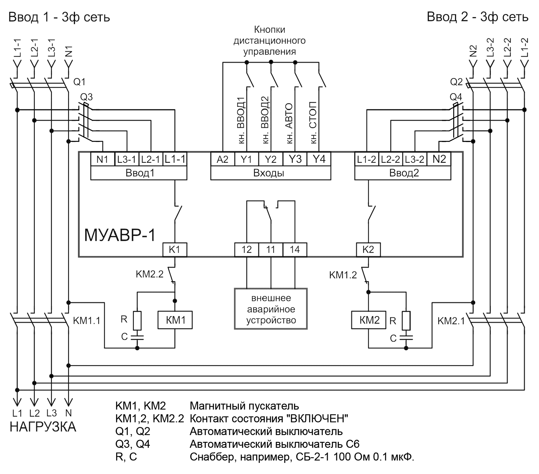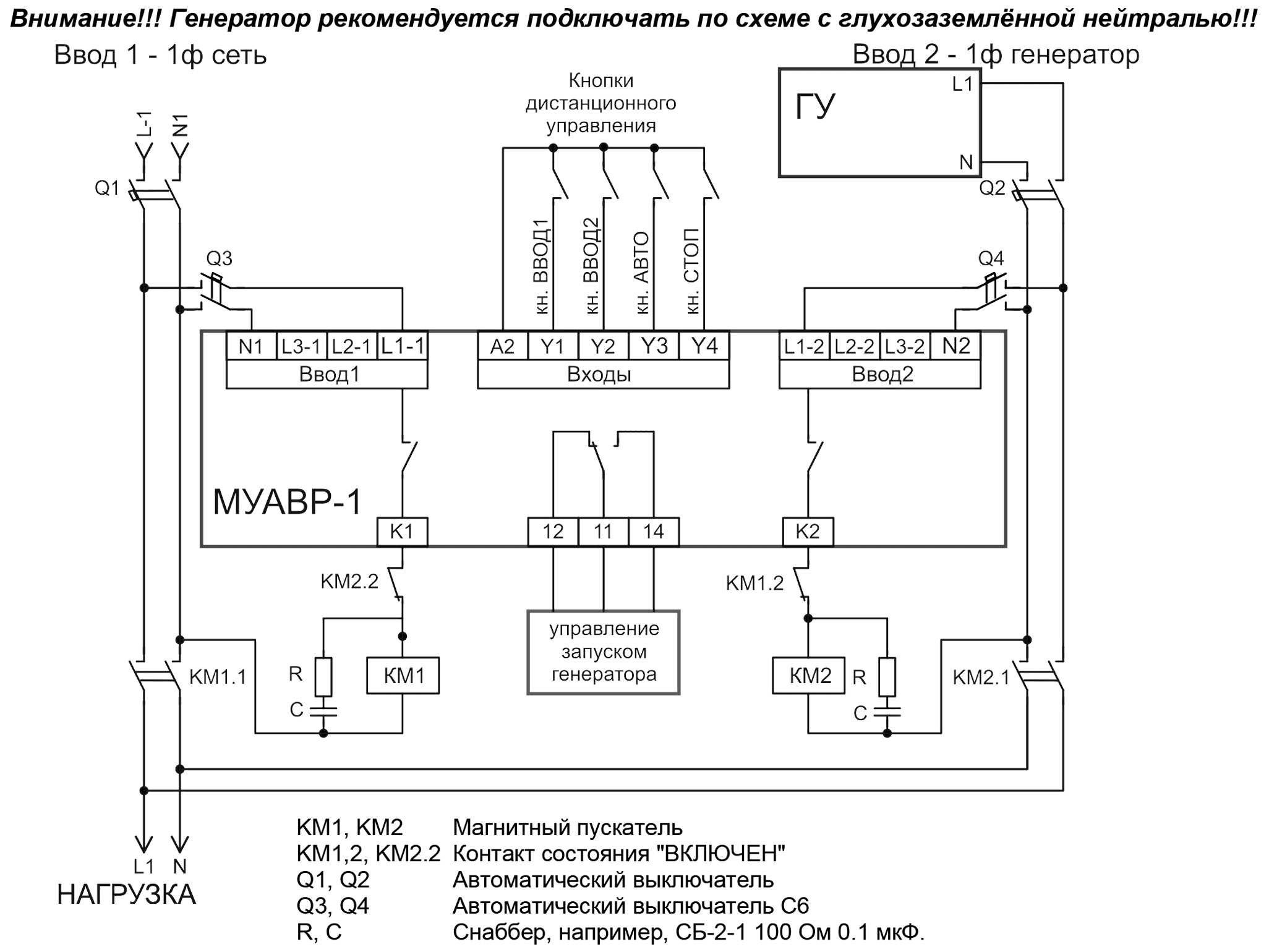Подключение нагрузки обеспечивает коммутационное устройство (КМ) электромагнитного типа, контактор или пускатель управляемые модулем. При аварии на основном вводе производится отключение нагрузки от основного ввода и переключение на резервный ввод. При восстановлении питания на основном вводе нагрузка автоматически переключается с резервного ввода на основной (при установленном приоритете линии).