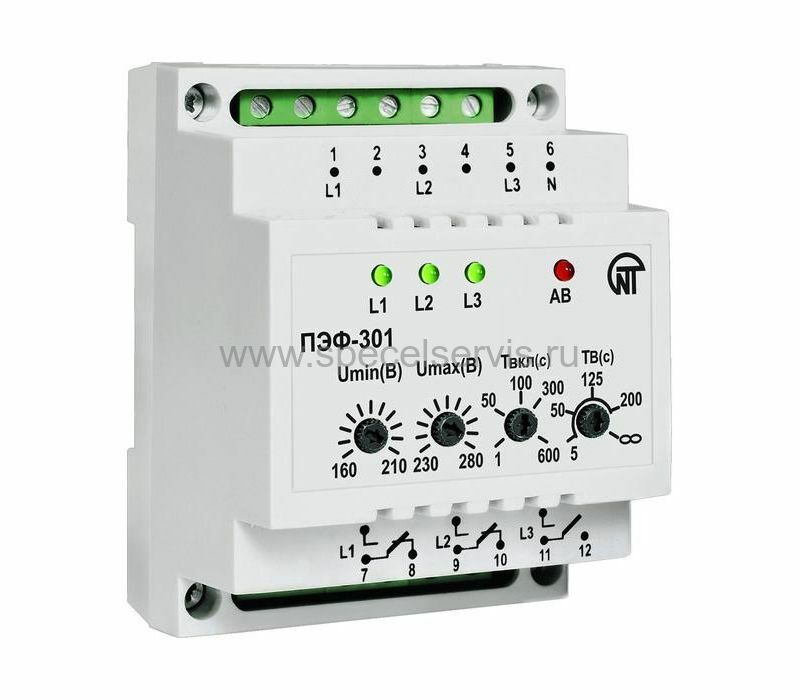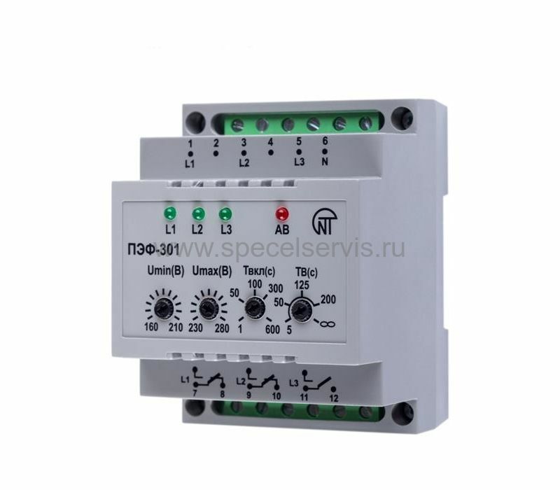 Электронный переключатель ПЭФ-301 – микропроцессорное цифровое устройство подключаемое к трехфазной сети через клеммы 1 (L1), 3 (L2), 5 (L3), 6 (N).