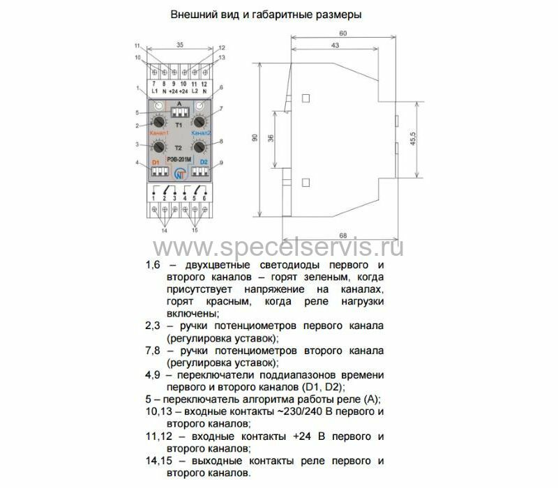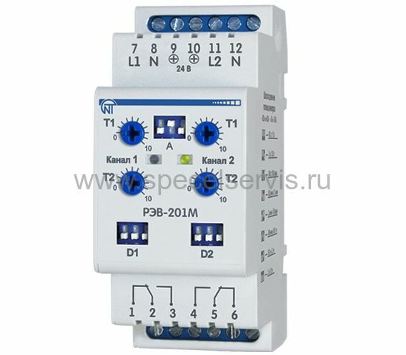 Электронное двухканальное реле времени РЭВ-201М предназначено для коммутации электрических цепей переменного тока 230/240 В 50 Гц и постоянного тока 24-100 В с регулируемой выдержкой времени. Содержит два канала и может работать по одному из семи алгоритмов работы, задаваемому пользователем.