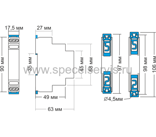 Реле выпускаются в унифицированном пластмассовом корпусе с передним присоединением проводов питания и коммутируемых электрических цепей. Крепление осуществляется на монтажную рейку-DIN шириной 35 мм (ГОСТ Р МЭК 60715-2003) или на ровную поверхность. Для установки реле на ровную поверхность замки необходимо раздвинуть. Конструкция клемм обеспечивает надёжный зажим проводов сечением до 2,5мм2. На лицевой панели реле расположены: поворотный переключатель установки выдержки времени паузы «tпаузы», поворотный переключатель установки выдержки времени импульса «tимпульса», жёлтый индикатор срабатывания встроенного реле «