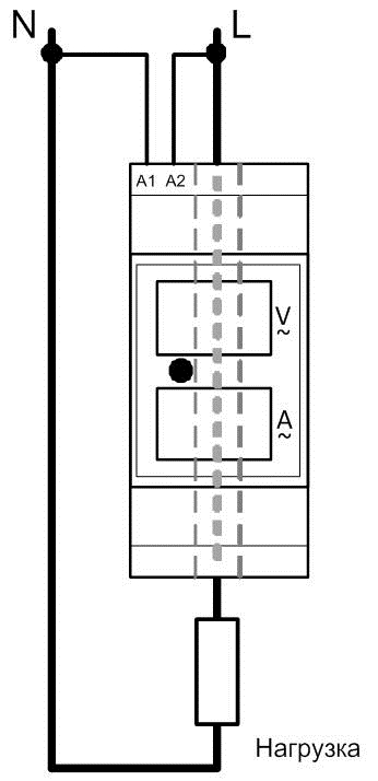 Вольтамперметр не требует оперативного питания и подключается непосредственно в измеряемую цепь (клеммы А1 и А2). Ток измеряется бесконтактным способом, с помощью встроенного трансформатора тока. Проводник с измеряемым током пропускается сквозь отверстие в корпусе (сверху вниз или снизу вверх не имеет значения) . Схема подключения изображена на рисунке ниже и на корпусе прибора.