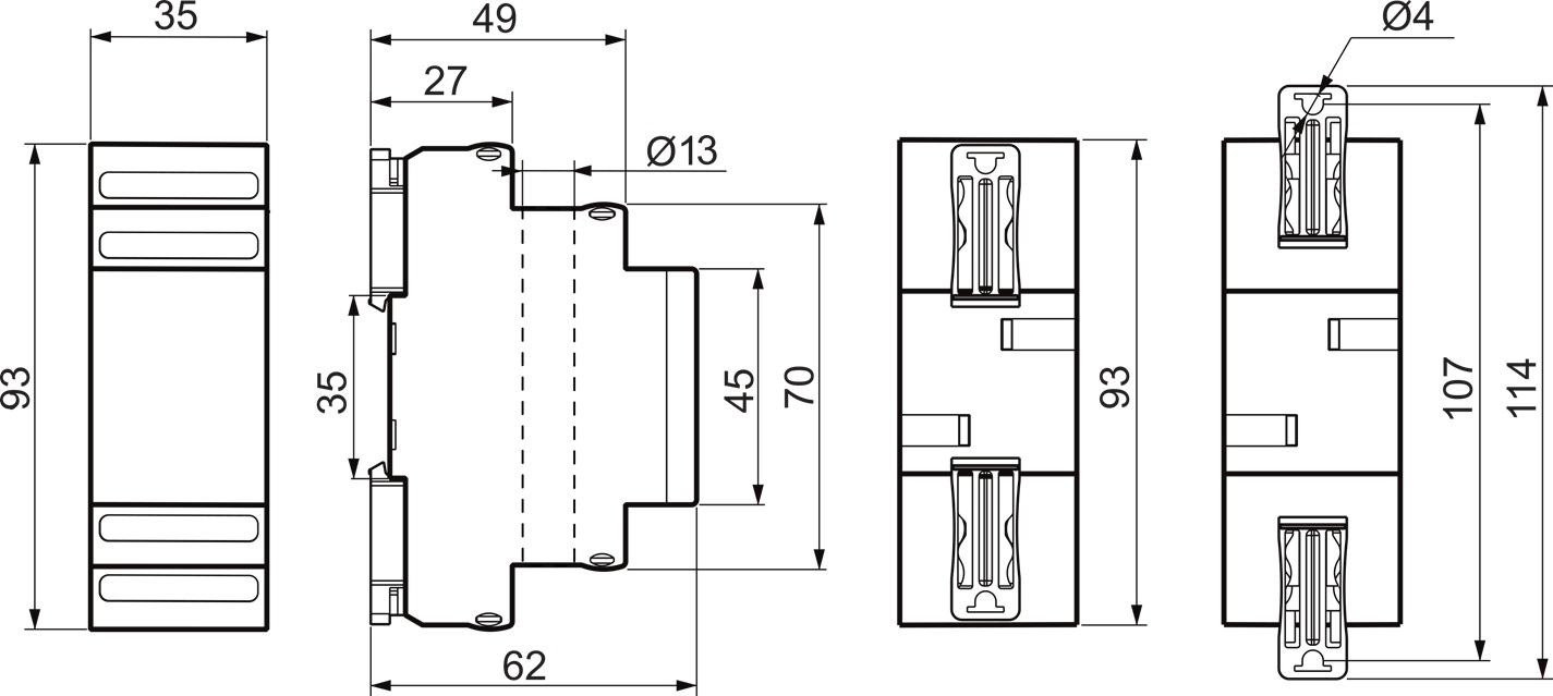 Вольтамперметр выпускается в пластмассовом корпусе с передним присоединением. Крепление осуществляется на монтажную рейку - DIN шириной 35 мм (ГОСТ Р МЭК 60715 - 2003). Конструкция клемм обеспечивает зажим проводов сечением до 2,5 мм2. На лицевой панели прибора расположены цифровые индикаторы отображающие величину напряжения и тока, кнопка. Индикаторы имеют высокую яркость свечения, обеспечивающую считывание информации при любой освещённости. Возможно крепление прибора на ровную поверхность винтами (шурупами).