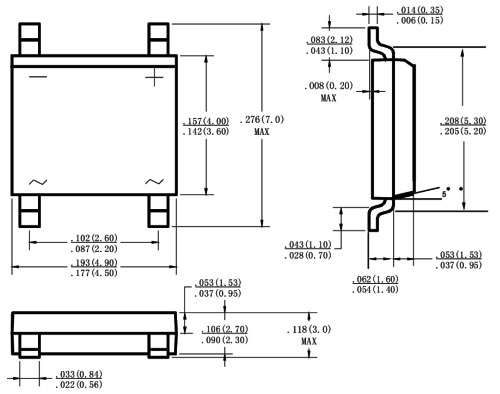 Миниатюрная сборка B8S представляет собой выпрямительный мост из четырех диодов, рассчитанный на выпрямленный за полупериод ток 0,8 А без необходимости использования дополнительного теплоотвода. При этом максимальное постоянное обратное напряжение достигает 800 В, а предельно допустимый импульсный ток через диоды достигает величины 30 А, что позволяет использовать в схеме после выпрямительного моста сглаживающий конденсатор большой емкости.