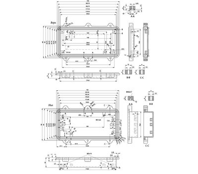 Герметичность оценивается классом защиты IP67, это обусловлено наличием силиконовой прокладки и тем, что отверстия для крепления корпуса к поверхности монтажа и заущины для крепления крышки находятся вне герметизируемой области. В отверстиях для крепления крышки к основанию имеются углубления под болты.