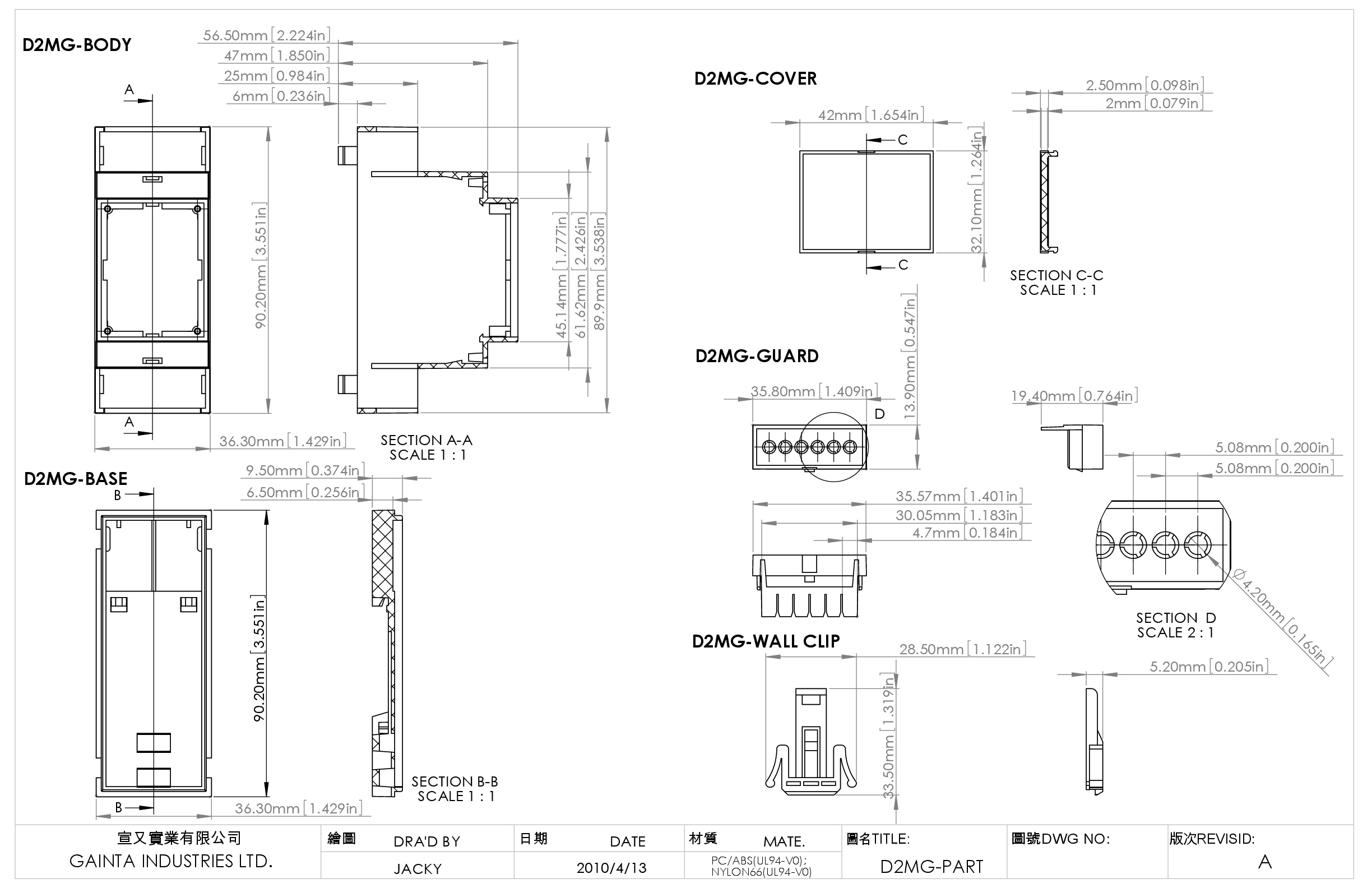 Пластиковый корпус на DIN-рейку D2MG, 36.3х90.2х57.5 мм