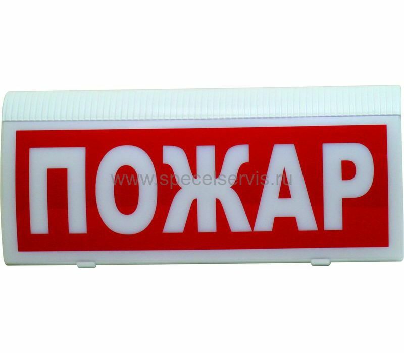 Предназначен для оповещения о пожарной тревоге на объекте. При пожаре оповещатель подсвечивает табло с надписью «ПОЖАР» мигающим белым светом, информируя о произошедшем возгорании и необходимости покинуть помещение. Дополнительно оповещатель сигнализирует о пожарнойтревоге с помощью сирены.