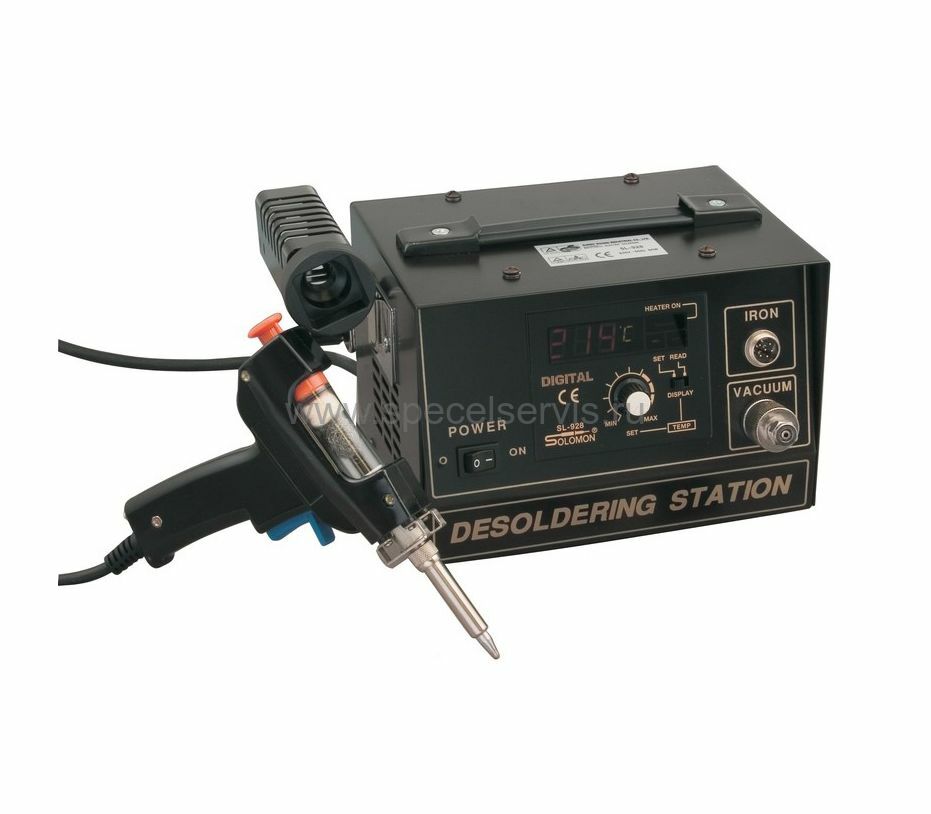 Модель SL-928 предназначена для выпаивания электронных компонентов и устранения дефектов пайки. Станция состоит из основного блока и демонтажного пистолета. Компрессор внутри основного блока создает вакуумное разряжение до 500 мм. рт. ст. Температура жала поддерживается на постоянном заданном уровне в диапазоне от 210 до 480 °С и индицируется посредством семисегментных индикаторов на основном блоке. Для удобства очистки и контроля загрязнения, контейнер демонтажного пистолета выполнен из прозрачного огнеупорного стекла.