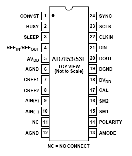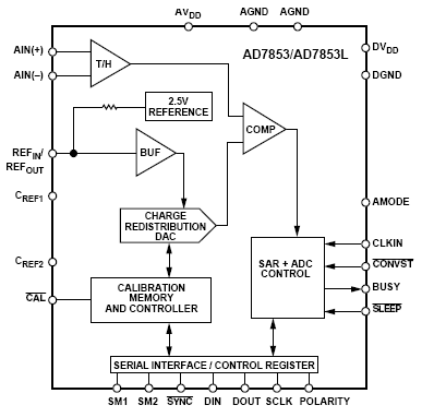 AD7853AR – это высокоскоростные 12-разрядные АЦП с низким энергопотреблением, работающие от одного источника питания напряжением 3 или 5 В. АЦП включается при заданных по умолчанию условиях, при которых он может работать как АЦП только для чтения. АЦП содержит функции самокалибровки и системной калибровки по времени и температуре для обеспечения точной работы, а также имеет ряд опций отключения питания для приложений с низким энергопотреблением. AD7853AR способен работать с частотой 200 кГц. Входной сигнал track-and-hold (500 нс) имеет псевдодифференциальную схему дискретизации. Диапазон напряжений АЦП составляет от 0 до VREF как с прямым двоичным кодированием, так и с двухкомпонентным кодированием выходных данных. Диапазон напряжений входных сигналов соотносится с напряжением источника питания. Устройство способно преобразовывать сигналы полной мощности до 100 кГц.