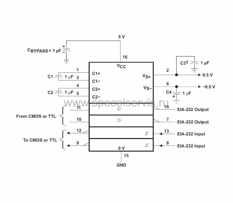 Приемники имеют типовой порог 1,3 В и гистерезис 0,5 В, а также выдерживают входное напряжение ±30 В. Соответственно каждый драйвер преобразует входные уровни TTL/CMOS в уровни интерфейса RS-232.