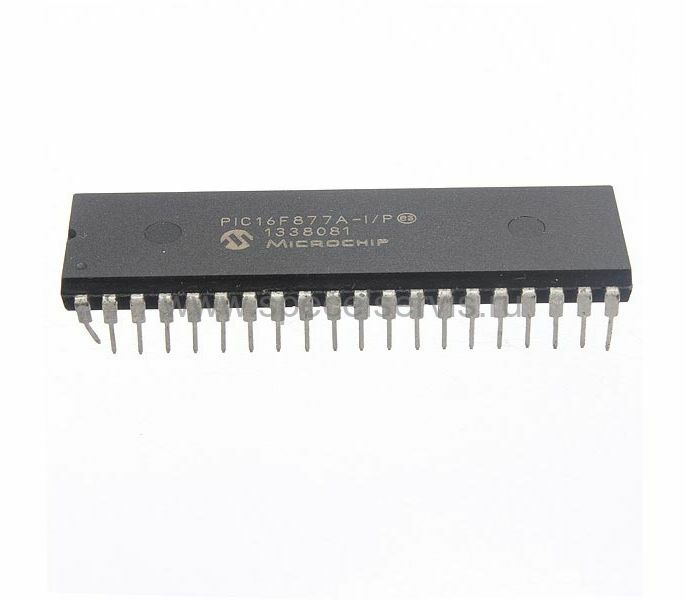 PIC16F877A-I/P - 8-ми битный микроконтроллер линий передачи данных на базе ядра PIC® 16 с флэш-памятью 14/368 килобайт и тактовой частотой 20 мГц. Включает в себя такие интерфейсы как: I2C, SPI, USART.