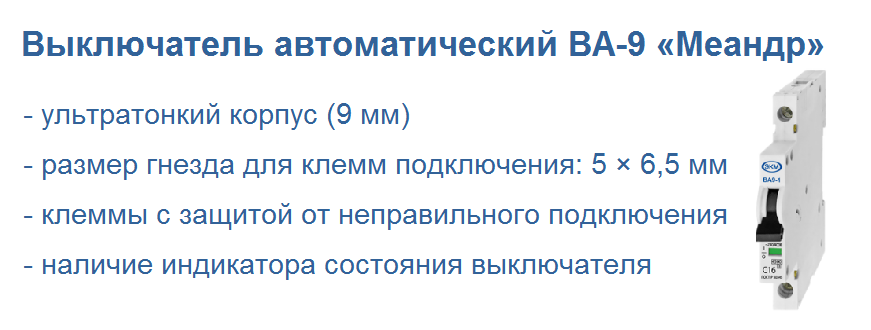 Автоматические выключатели (или автоматы) в ультратонком корпусе ВА-9 от компании «Меандр» – новое поколение электрических коммутационных аппаратов, служащих для защиты электрических цепей от перегрузок и токов короткого замыкания, а также для ручного отключения участков электрических цепей при необходимости. Автоматические выключатели ВА-9 могут иметь характеристику отключения В или С. В конструкции автоматов реализованы одновременно две системы защиты от сверхтоков: тепловая и электромагнитная, характеристики которых согласованы между собой.