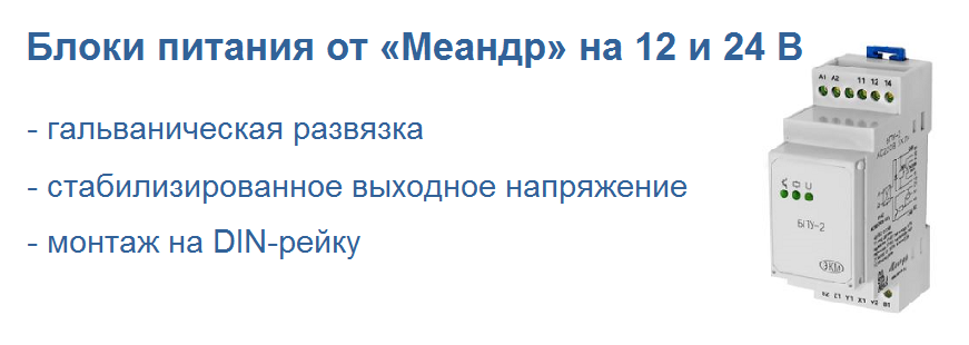 Блоки питания БПУ-2 и БПИ-13 на DIN-рейку от компании «Меандр» – это источники вторичного электропитания с гальванической развязкой и стабилизированным выходным напряжением, предназначенные для питания различных устройств, таких как бесконтактные датчики, тиристорные коммутаторы, контроллеры управления и другие устройства.