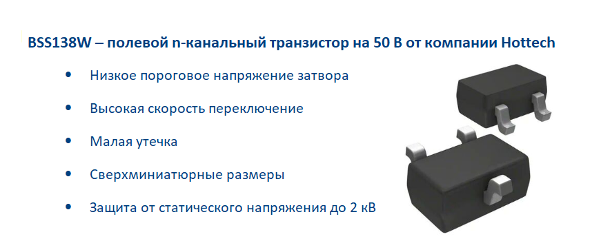 Полевые транзисторы BSS138W от компании Hottech, рассчитанные на рабочее напряжение 50 В и ток 0,3 А, имеют сверхмалое сопротивление в открытом состоянии и предназначены для портативного оборудования. Транзисторы выполнены в корпусе для поверхностного монтажа SOT-323. На складе компании «Спецэлсервис» имеется большой ассортимент полевых транзисторов Hottech различного назначения по доступной цене. Вся продукция поставлена непосредственно от производителя. Оформить заказ можно через сайт интернет-магазина «Спецэлсервис» или связаться с отделом продаж по электронной почте.