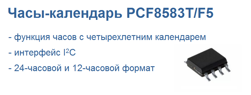 PCF8583T/F5 – это микросхема, на кристалле которой реализованы часы и календарь на базе 2048-битной статической оперативной КМОП-памяти, организованной в виде 256 слов по 8 бит. Адреса и данные передаются последовательно через двухпроводную двунаправленная шину I2C. Встроенный адресный регистр увеличивается автоматически после каждого записываемого или считываемого байта данных. Адресный вывод A0 используется для задания аппаратного адреса слов, что позволяет подсоединять к шине два устройства без дополнительного оборудования. Встроенный генератор с частотой 32,768 кГц и первые 8 байт оперативной памяти используются для часов, календаря и функции счетчика. Следующие 8 байт могут быть запрограммированы в качестве сигнальных регистров или используются как свободное пространство оперативной памяти. Остальные 240 байт оперативной памяти свободны.