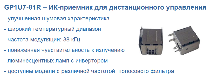 GP1U7-81R – это приемник инфракрасного излучения для использования в системах дистанционного управления телевизоров, видеомагнитофонов, телевизионных приставок, кондиционеров и т.д. Приемник выделяет управляющие пакеты данных из инфракрасного сигнала, модулированного частотой 38 кГц. Металлический корпус приемника надежно экранирует его компоненты от внешних электромагнитных помех. Выводы для пайки в отверстия платы имеют угловое расположение. Серьезным преимуществом приемника GP1U7-81R является его низкая чувствительность к излучению ламп дневного света с инвертором. Производитель приемника – японская корпорация Sharp.