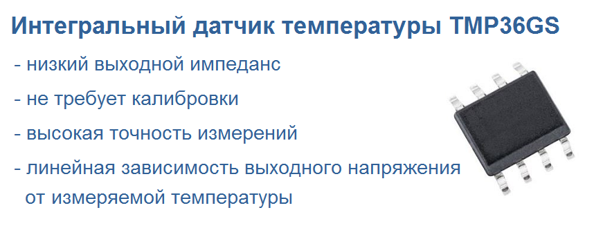TMP36GS – это низковольтные прецизионные датчики температуры, выходное напряжение которых линейно пропорциональное температуре, измеряемой в градусах Цельсия. TMP36GS не требуют никакой внешней калибровки. Точность измерения составляет ±1 °C при +25 °C и ±2 °С в диапазоне от -40 °C до +125 °C. Низкий выходной импеданс датчика, линейная зависимость выходного напряжения от температуры и точная калибровка упрощают его сопряжение со схемой контроля температуры и аналого-цифровыми преобразователями.