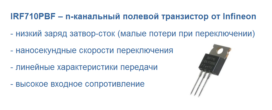 IRF710PBF– это мощный n-канальный полевой МОП (MOSFET) транзистор, предназначенный для использования в источниках вторичного электропитания, регуляторах, стабилизаторах и преобразователях, схемах управления электродвигателями и других блоках и узлах радиоэлектронной аппаратуры. Транзистор может управляться непосредственно интегральными микросхемами.