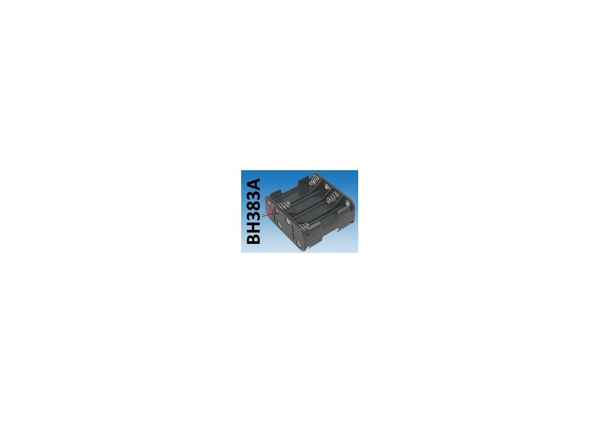 Батарейный отсек BH383A, производства тайваньской компании Comfortable Electronic, представляет собой пластиковый корпус с гнездами для установки в него восьми элементов питания типа AA (UM3, R6, 316), что дает суммарное напряжение 12,0 В. Подключение всей батареи осуществляется проводами AWG26 в изоляции черного и красного цвета общей длиной 150 мм. Для упрощения пайки, концы проводов уже зачищены и облужены на 5 мм.