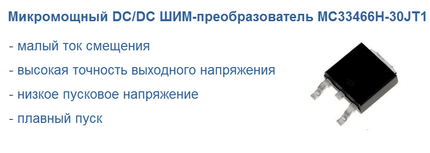 Импульсный регулятор напряжения от компании Motorola MC33466H-30JT1 – это микромощный переключающий DC/DC регулятор напряжения, специально разработанный для портативных устройств, чтобы обеспечить регулируемое выходное напряжение с использованием минимального количества внешних деталей. Устройство имеет очень маленький ток смещения (типовое значение 15 мкA). MC33466H-30JT1 содержит высокоточный генератор опорного напряжения, ШИМ-контроллер, управляющий транзистор, усилитель ошибок и резистивный делитель обратной связи. Благодаря малому току смещения MC33466H-30JT1 идеально подходит для использования в переносных компьютерах, бытовом и промышленном оборудовании, где желательно продлить срок службы батареи питания.