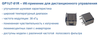 GP1U7-81R – это приемник инфракрасного излучения для использования в системах дистанционного управления телевизоров, видеомагнитофонов, телевизионных приставок, кондиционеров и т.д. Приемник выделяет управляющие пакеты данных из инфракрасного сигнала, модулированного частотой 38 кГц. Металлический корпус приемника надежно экранирует его компоненты от внешних...