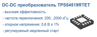 Понижающий синхронный подстраиваемый преобразователь постоянного тока TPS54519RTET позволяет создавать малогабаритные конструкции за счет интегрированных МОП-транзисторов, малого количества внешних компонентов, малой индуктивности и минимизации площади под микросхемой на плате. TPS54519RTET имеет термостойкий 16-выводной корпус QFN размером 3×3 мм. Встроенные...