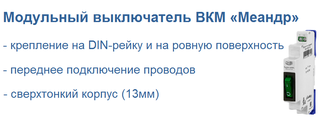Выключатель модульный ВКМ от компании «Меандр» применяется в распределительных шкафах жилищных и индустриальных электрических сетей для управления маломощными нагрузками, такими как освещение, релейная автоматика, контакторы, пускатели, охранные системы и т.д.