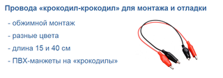 Изолированные соединительные провода с двумя зажимами типа «крокодил» используются в процессе монтажа и отладки электрорадиоаппаратуры, низковольтной электрики и любых других слаботочных схем. Для исключения случайного замыкания с токоведущими проводниками стальные хромированные зажимы защищены изолирующими ПВХ-манжетами. Соединение проводов с «крокодилами» – обжимное,...