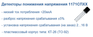 Микросхемы 1171СПХХ являются детекторами понижения напряжения, которые применяются в аппаратуре, где нужно получить предупреждающий сигнал об изменении контролируемого напряжения ниже установленного уровня.