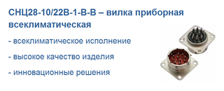 Соединители (вилки) СНЦ28-10/22В-1-В предназначены для работы в электрических цепях постоянного, переменного (частотой до 3 МГц) и импульсного токов при напряжении до 700 В. Приборные вилки СНЦ28 изготавливаются в герметичном исполнении без кожуха и сочленяются с розетками СНЦ23, выпускаемыми по техническим условиям ГЕ0.367.241ТУ. Вилки имеют многошпоночную поляризацию...