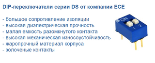 Микропереключатели серии DS (EDG10xS) от компании ECE представляют собой движковые переключатели с конфигурацией контактов SPST. Переключатели помещены в общий DIP-корпус. При монтаже переключателей на печатную плату возможна пайка волной, для чего корпус с нижней стороны защищен эпоксидной смолой, предотвращающей возможное попадание флюса на контактные площадки....