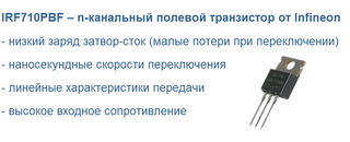 IRF710PBF – это мощный n-канальный полевой МОП (MOSFET) транзистор, предназначенный для использования в источниках вторичного электропитания, регуляторах, стабилизаторах и преобразователях, схемах управления электродвигателями и других блоках и узлах радиоэлектронной аппаратуры. Транзистор может управляться непосредственно интегральными микросхемами.