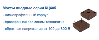 КЦ405 – это выпрямительная диодная сборка, состоящая из кремниевых диффузионных диодов. В корпусе сборки расположены четыре диода, соединенные по схеме однофазного двухполупериодного моста Гретца (всем привычный, ставший классическим диодный мост).
