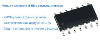 Микросхемы 74HC03D.653 от компании NXP представляет собой четыре логических элемента И-НЕ с открытыми стоком, выполненные по технологии КМОП. На входах каждого элемента установлены зажимные диоды, которые позволяют использовать токоограничивающие резисторы для подключения входов к цепям с напряжениями, превышающими VCC.