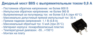 Миниатюрная сборка B8S , производства гонконгской копании Kingtronics, представляет собой выпрямительный мост из четырех диодов, рассчитанный на выпрямленный за полупериод ток 0,8 А без необходимости использования дополнительного теплоотвода. При этом максимальное постоянное обратное напряжение достигает 800 В, а предельно допустимый импульсный ток через диоды достигает...