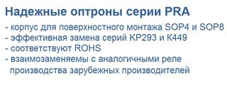 Оптоэлектронные реле серии PRA , производства ведущего отечественного производителя ОАО «Протон» , размещаемые в корпусах для поверхностного монтажа SOP4 и SOP8, могут эффективно заменять аналогичные серии КР293 и К449 в корпусах DIP и SOIC. Все реле полностью соответствуют европейской директиве RоHS.